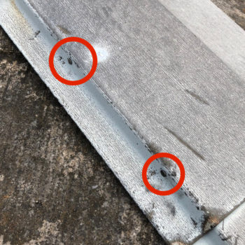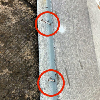 「無料点検」でお伺いしました。屋根に大きな目立った問題はありませんでしたが、板金部分に釘浮きが数か所確認されました。 この釘浮き現象は7~8年程度で熱膨張等の理由から自然に発生してしまう現象ですが、たかが釘が浮いた程度で...と放置しておくと 1)釘穴の隙間からの雨漏り 2)屋根材の飛散 3)屋根材の変形(元来固定用釘なので) など様々なトラブルの原因になってしまいます。 定期的なメンテナンスでお家の健康維持を!! |