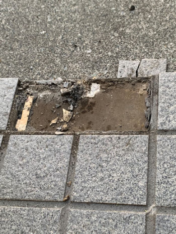 「玄関前タイルが数枚破損しています」というご相談でした。 1枚に欠けとヒビ、もう1枚に浮きが確認されました。 そのため 1)該当箇所のみの補修 をご提案いたしました。 |