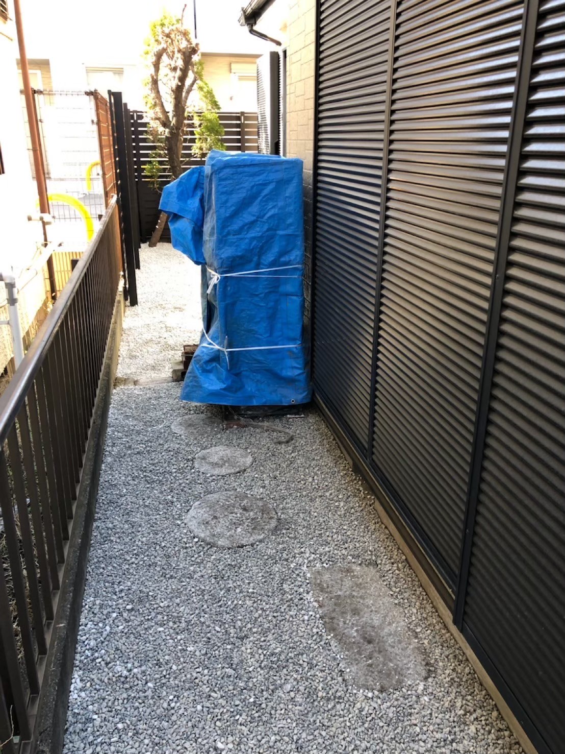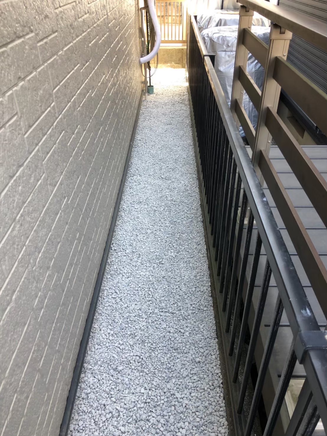 雑草を除去し、防草シートと砂利を敷いた後の通路の様子です。すっきりとした見た目で、通行が容易になりました。
