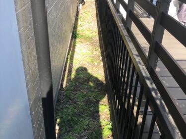 こちらは、フェンス横の写真です。雑草が密集しており、美観を損ねています。雑草を取り除き、防草シートを敷いた上で砂利を敷くことで、見た目もすっきりとした仕上がりを目指します。
