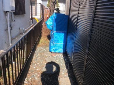 こちらは、家の側面にある狭い通路の写真です。雑草が生い茂っており、通行の妨げになっています。雑草の除去と防草シートの設置を行い、砂利を敷くことで、雑草の再発を防ぎます。