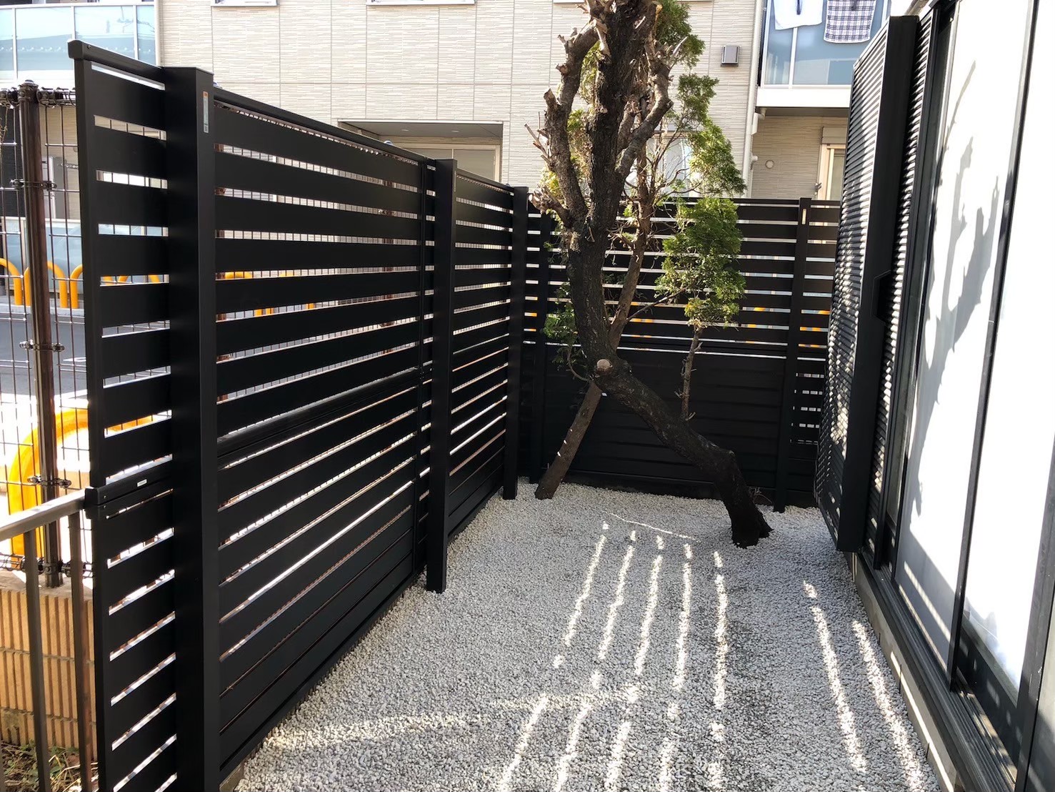 防草シートと砂利を敷いた後のフェンス横の様子です。雑草の再発を防ぎ、美観を保つことができます。